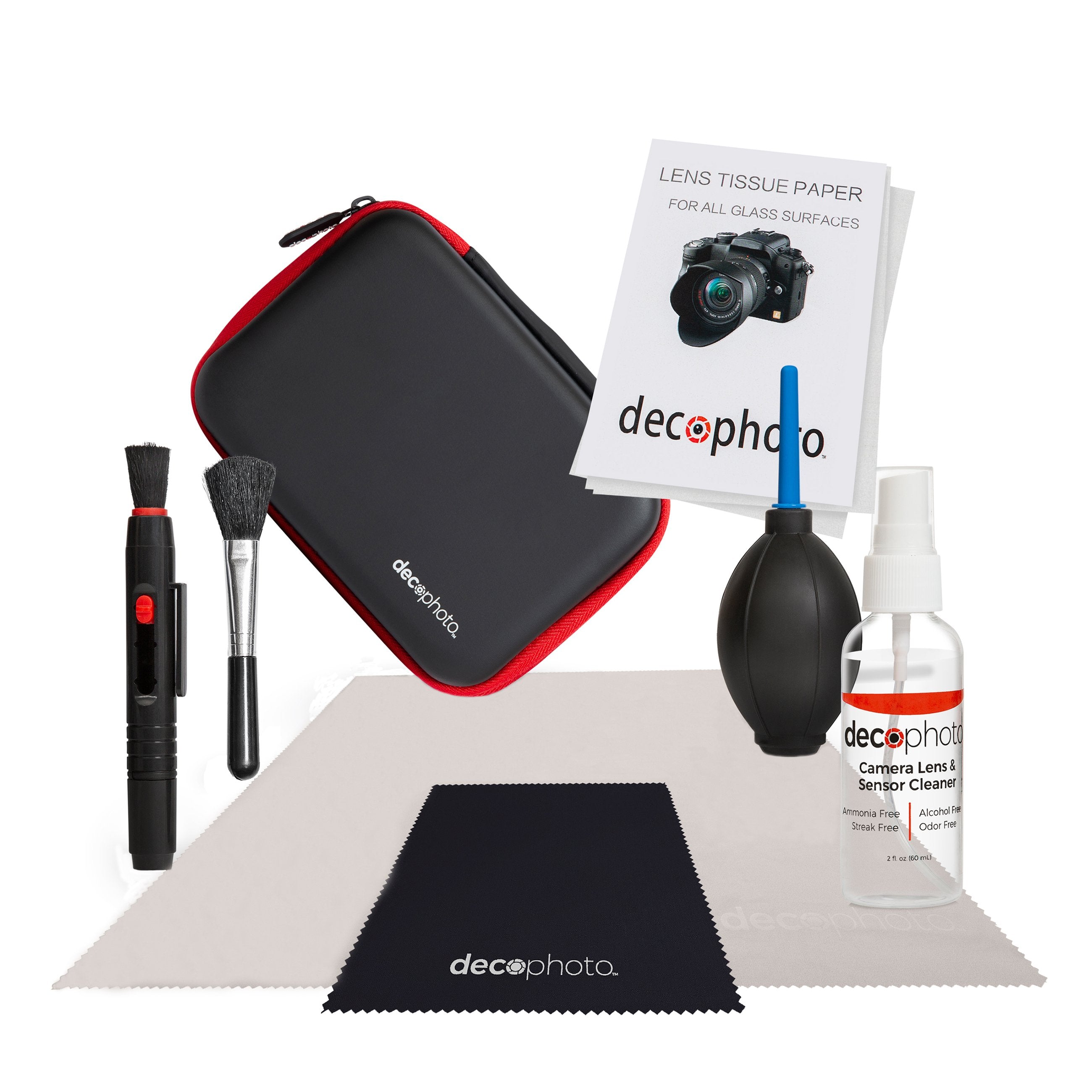 Deco Photo’s All in One Cleaning Kit is perfect for cleaning your DSLR camera as well as Telescopes, Spotting Scopes, Eyeglasses, View Finders and more. Inside the stylish carrying case you'll find Lens/Sensor cleaning solution, a book of lens tissue paper, a dual sided pen with a brush and carbon cap, large bristel brush and an air blower to blow away hard to reach dust and build-up.