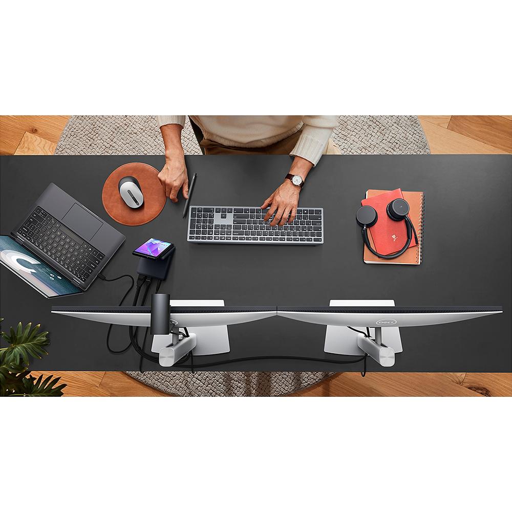 Compact footprint: This Dell dock has one of the smallest footprints and takes up 40% less desk space. Compare with the size of a traditional dock dotted in blue.