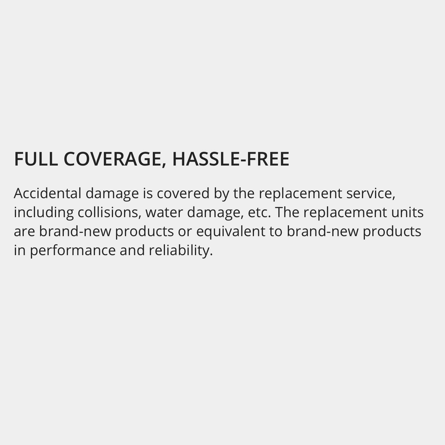 Accidental damage is coveredby the replacement service, including collsions,water damage, etc. The replacement unites are brand new products or equivalent to brand new products in performance and reliabilty.