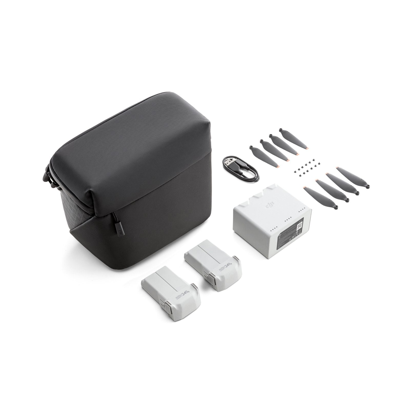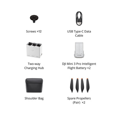 DJI Mini 3 Pro Fly More Kit includes two Intelligent Flight Batteries, a Two-Way Charging Hub, data cable, shoulder bag, spare propellers, and screws, providing comprehensive support for your aerial photography experience, at a better price than buying separately.