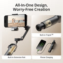 The Osmo Mobile 7 phone gimbal features an integrated foldable design with a built-in tripod, making solo creation effortless and storage hassle-free.