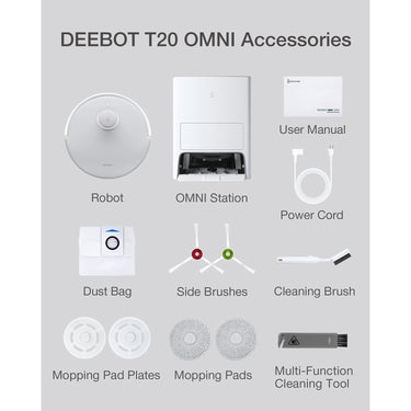 (Antibacterial Filter *1 in)DEEBOT*1 (Antibacterial Dust Bag *1 in) OMNI station*1 mopping pad plate *1 couple mopping pad *1 couple power cord*1 side brush*1 couple User Manual*1 Quick guide*1 Cleaning brush*1 Multi-function cleaning tool*1