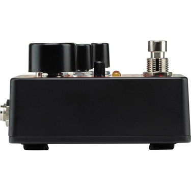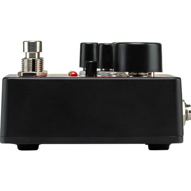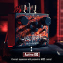 The EHX Hell Melter’s expanded control set includes Gain and Level controls, and a powerful active EQ featuring with parametric mids for improved versatility. The Dry level control allows for blending your input signal for improved low-end when used with a bass or even blending in other distorted tones.