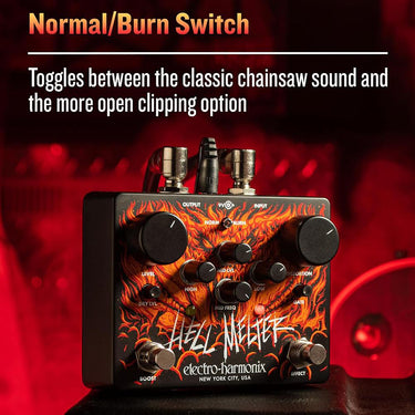 With its take on the cult-classic, chainsaw distortion pedal, the EHX Hell Melter takes distortion to its extremes. The Hell Melter features expanded controls and tonal capabilities, allowing the already in-your-face sound of the pedal to broaden by switching to more open clipping options and boosting the internal voltage for increased headroom, less compression, and more attack.