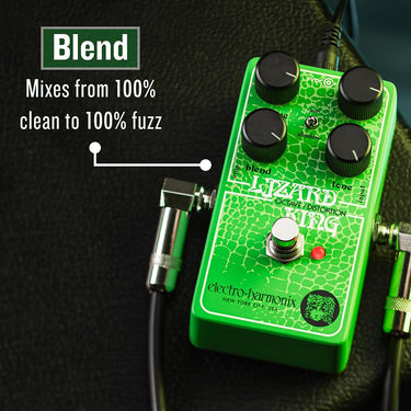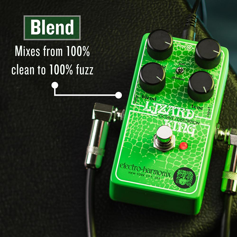 The EHX Lizard King is a fixed-gain fuzz that is dynamically responsive. Adjustments to your instruments volume affects the amount of fuzz. Lower instrument volumes create a clear, fuzzy overdrive, while full instrument volume sends the gain over the top for ripping riff and searing solo tones. The familiar VOLUME and OCTAVE knobs control overall output and octave blend volume respectively. New to the Lizard King, the BLEND knob sets the mix between your clean and fuzz tones to create the perfect balance of fuzz while retaining your bassās attack and low-end. The TONE knob is a low pass filter that rolls off the highs, while the SUN/SHADOW switch further enhances the tone of the octave fuzz and clean tones. SUN boosts the octave fuzz with a more driving midrange, and the clean tone accessed by the BLEND knob has more treble and bass frequencies. When the switch is set to SHADOW, the clean tone is unchanged, and fuzz tone is tighter.