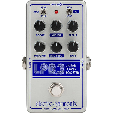 Housed in EHXās Nano-sized chassis, the LPB-3 is capable of boosting up to +33dB of clean gain with the powerful tone shaping of a 3-band EQ with parametric Mids. The active 3-Band EQ features TREBLE and BASS knobs to control the highs and lows plus a powerful parametric Mids control with adjustable MID FREQ and Q. BOOST sets the overall output of the pedal with the MAX switch toggling between 20dB and 33dB of maximum boost. Use the PRE-GAIN knob to fine-tune the total gain and volume of the boost.