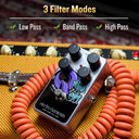Mode Rotary Switch (LP/BP/HP): Determines the frequency range that the filter allows to pass through, LP (Lowpass) mode emphasizes low frequencies, BP (Bandpass) middle frequencies, and HP (Highpass) high frequencies.