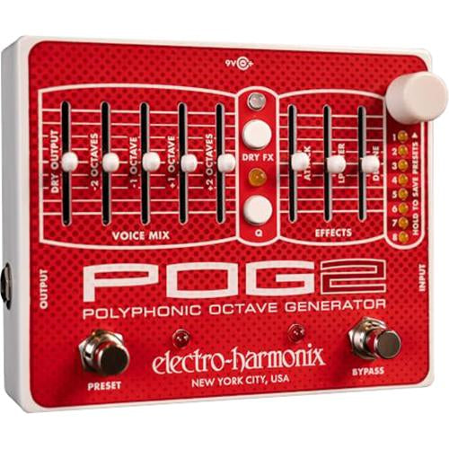 Back in 2005, Electro-Harmonix unveiled the original POG, a polyphonic octave generator that enabled guitarists to conjure everything from the surreal jangle of an 18-string guitar, to rich, thick walls of symphonic sound. The EHX POG2 Polyphonic Octave Generator will take you even higher. Use the new attack control to fade in lush, smooth swells. Tune in the new second sub-octave to reach deeper than ever before. The 2-pole resonant low-pass filter now includes two additional Q modes. Slide in the newly enhanced detune to further refine your sound.