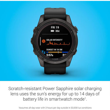 Get up to 14 days in smartwatch mode with solar charging in 3 hours of direct sunlight (50,000 lux) per day and up to 46 hours in GPS mode with solar charging (assumes continuous use for entire period in 50,000 lux conditions).