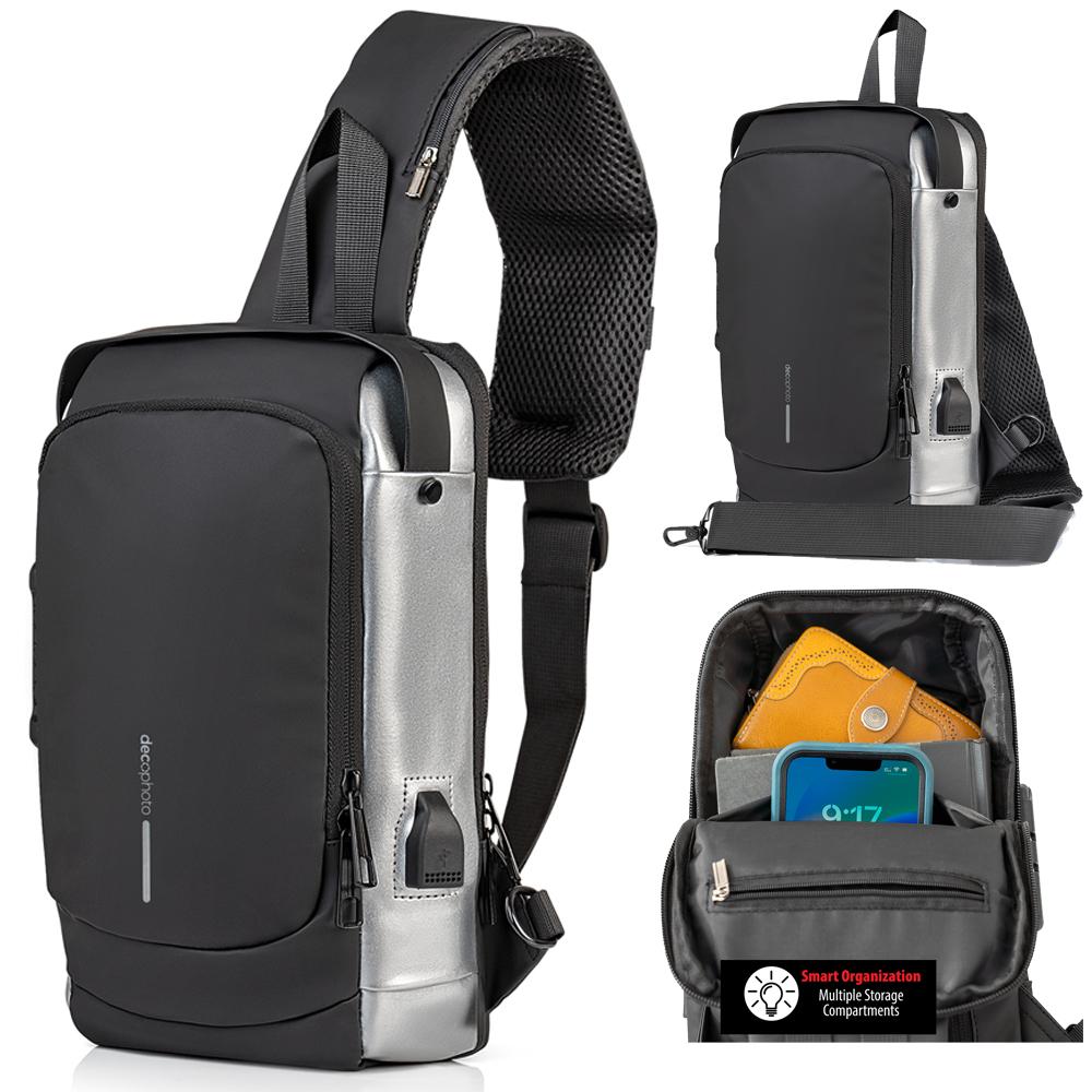 - Deco Essentials Sling Backpack, Anti-Theft Combo Zipper Lock, External USB Charging, Waterproof