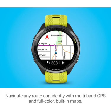 Train brilliantly with Forerunner® 965, the premium GPS running and triathlon smartwatch with a bright AMOLED touchscreen display and lightweight titanium bezel. Wake up to your morning report with HRV status to see health insights with an overview of sleep, recovery and training outlook (data presented is intended to be a close estimation of metrics tracked). The training readiness feature tells you when you’re primed for a productive session — while daily suggested workouts adapt to performance and recovery alongside the race widget, which provides training tips, course details and completion time predictions. Navigate any route confidently with multi-band GPS and full-color, built-in maps. With traditional buttons and a touchscreen display, it’s easy to tap into your training status and know whether you’re training productively, peaking or strained. If you’re pushing to outshine the competition, the Forerunner 965 is there to light up every run with up to 23 days of battery life in smartwatch mode.