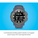Luminescent analog watch hands in a bold, rugged watch body with dual-layered bezel. Combines a classic analog experience with smart functionality on an easy-to-read high-resolution digital display. Pair to your compatible Android or Apple smartphone to get smart notifications. Pay from your wrist with Garmin Pay contactless payment solutions with a supported country and payment network. With built-in sports apps for everything from strength training to running to mountain biking, you can train your way indoors or out. Explore the outdoors with GPS, GLONASS and Galileo navigation support and built-in ABC sensors. Up to 28 days of battery life in smartwatch mode; up to 25 hours in GPS mode; up to 71 days in battery saver mode. Ruggedly built to MIL-STD-810 for thermal and shock resistance and with a water rating of 10 ATM (Withstands pressures equivalent to a depth of 100 meters)