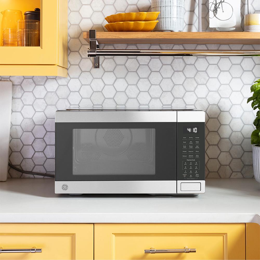 The GE 1.0 Cu. Ft. Capacity Countertop Convection Microwave Oven with Air Fry allows you to cook healthier, crispier versions of your favorite foods in less time, thanks to a built-in air fryer. Using microwave preset controls like Fries and Nuggets make operation quick and easy, while ensuring precisely cooked results. Included with microwave is a stainless microwave crisper pan specifically designed for use with Air Fry mode. This 1050-watt compact microwave also has convection mode, which includes a special rack that allows air to circulate around foods for even heat distribution for golden brown results. Automatic and time defrost options allow for maximum user control. At 1.0 cu. ft. capacity, this microwave offers the perfect balance of size and convenience, designed to fit perfectly in dorm rooms, offices and kitchens alike. Stylish and easy to clean, you can't go wrong with a stainless steel air-fry microwave.