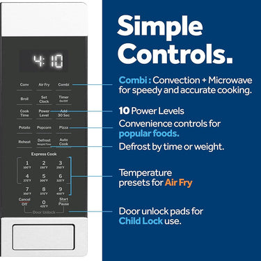 | Control Features | Air Fry Time Cook I & II Child Lock-Out Cooking Complete Reminder Start/Pause Cancel/Off Timer On/Off Clock - 12 Hr. Add 30 Seconds Auto & Time Defrost Express Cook - Instant-On 1-6 Minutes Auto Cook |