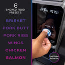 Anyone can create amazing results with this indoor electric smoker that offers six preset smoking functions, including Brisket, Pork Ribs, Pork Butt, Chicken Wings, Chicken Breast and Salmon as well as Keep Warm and Custom settings.