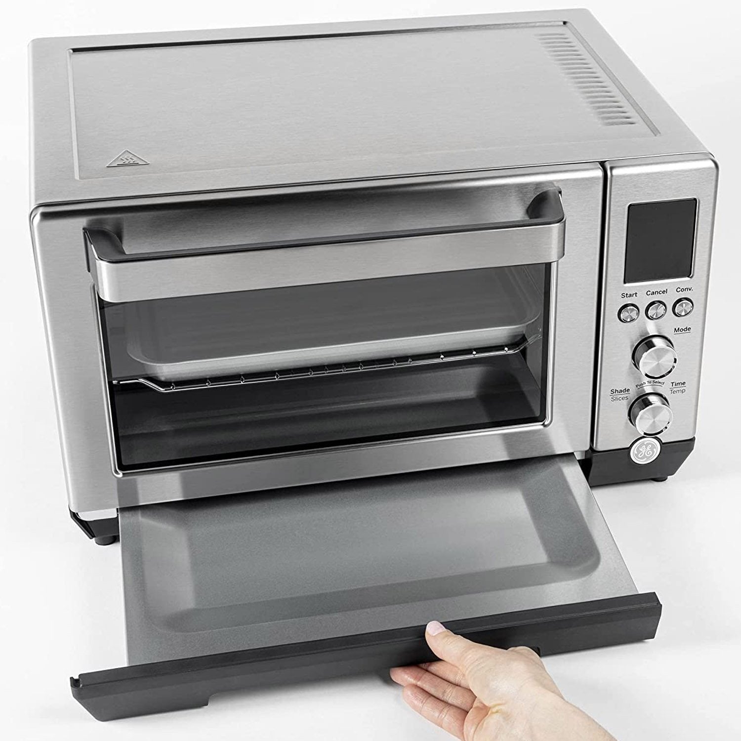 GE's reliable toaster oven features a classic stainless steel housing that goes with any kitchen style. It features a large toaster oven capacity that easily holds a 12" pizza, 6 slices of toast, or a 9"x11" baking pan.
