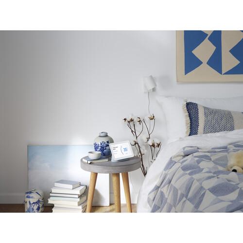 Nest Hub's simple design and subtle colors fit any room. The display adjusts to ambient room light, so it's not too bright or too dim. And it's built with the environment in mind – 54% of its plastic part material is made with recycled content.