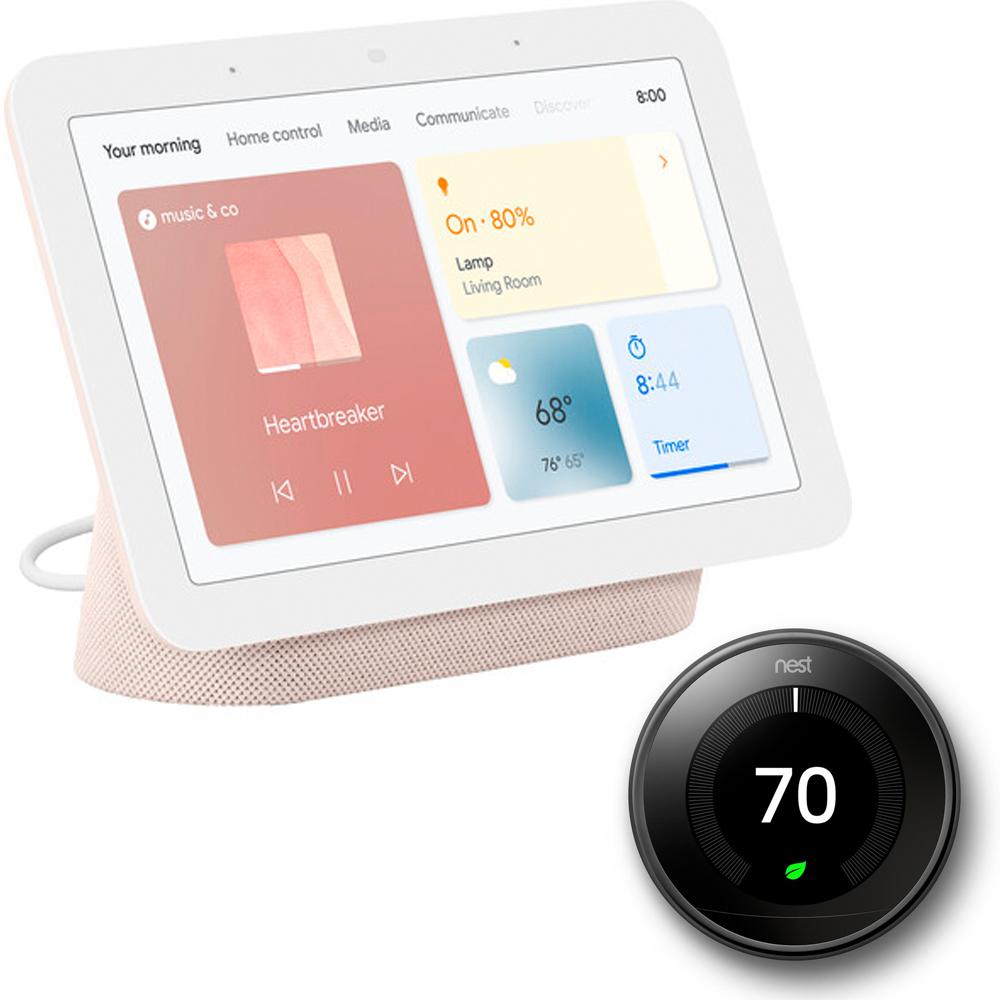 Google Nest Hub Display w/ Google Assistant, Sand (2nd Gen) + Learning Thermostat Black