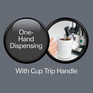 Commercial coffee urn with cup trip handle lets you fill cups fast with just one hand.