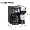 The Hamilton Beach FlexBrew Trio Coffee Maker lets you brew 3 ways. On the single-serving side, you'll enjoy fast brewing every morning because it brews a single cup in about 90 seconds. The single-serving side lets you brew 7 servings without refilling the 56 oz. water reservoir and provides multiple brewing options. You can brew a single cup with your favorite brand of pod (such as a K-Cup pod) or brew with ground coffee. Using a pod lets you brew 6, 8, or 10 oz. of coffee, and brewing with coffee grounds lets you choose from 5 brewing sizes: 6, 8, 10, 12 or 14 oz. On the carafe side, you can brew up to 12 cups of coffee with your favorite grounds, plus you can set up wake-up ready coffee with Easy-Touch programming. You can pour yourself a cup before brewing is finished with Auto Pause & Pour, and 2 hours after brewing, the power automatically shuts off. No matter how you brew, Select-a-Brew lets you choose bold or regular brewing strengths. Includes a glass carafe, single-serve pod holder, single-serve brew basket and a cup rest with a storage area for either.