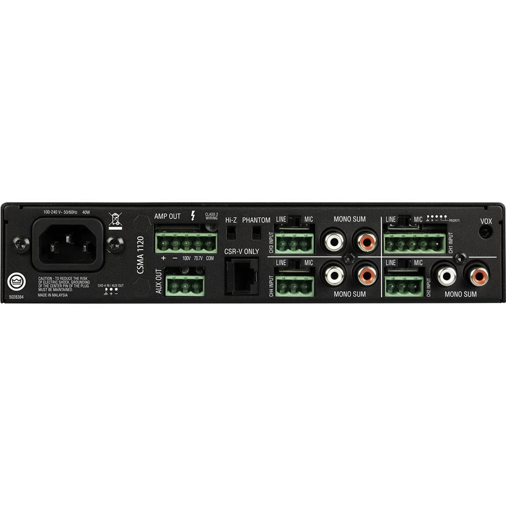 The CSMA mixer/amps offer unmatched ease of use; with a clean; front panel featuring only volume controls for each channel; master volume adjustment; adjustable bass and treble controls and a power switch. All the volume controls are surrounded by an illuminated ring; making them easy to see and operate in darkened environments. The amplifier can drive 8 ohm and 4 ohm loads and can be used with 70V and 100V distributed audio systems without the need for a separate transformer. In addition to balanced mic/line inputs; unbalanced RCA inputs and speaker connections; all units include RJ45 connectors for use with JBL CSR-V in-wall volume controls. All models feature a universal power supply which enables the ability to accept AC voltages from 100 to 240 VAC; 50/60Hz.