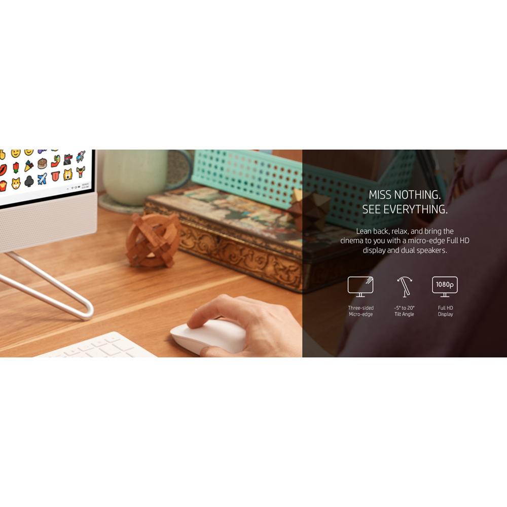 The HP All-in-One blends the power of a desktop with the beauty of a modern display. Powered by an Intel processor, bring the cinema to you with a three-sided micro-edge Full HD display and dual speakers. This AIO design includes sustainable materials and is thoughtfully designed to keep your space clutter-free with thoughtfully placed ports.