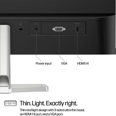 This thin-and-light 23.8-inch FHD monitor is designed to look great in any space. Whether learning, playing, or watching content, its ultra-thin 3-sided borderless design lets you create a seamless dual-screen setup for enhanced viewing, while the simplified cable management cuts the clutter. Plus, easily connect with HDMI 1.4 and VGA ports.