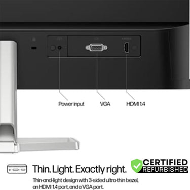 This thin-and-light 23.8-inch FHD monitor is designed to look great in any space. Whether learning, playing, or watching content, its ultra-thin 3-sided borderless design lets you create a seamless dual-screen setup for enhanced viewing, while the simplified cable management cuts the clutter. Plus, easily connect with HDMI 1.4 and VGA ports.