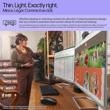 This thin-and-light 23.8-inch FHD monitor is designed to look great in any space. Whether learning, playing, or watching content, its ultra-thin 3-sided borderless design lets you create a seamless dual-screen setup for enhanced viewing, while the simplified cable management cuts the clutter. Plus, easily connect with HDMI 1.4 and VGA ports.