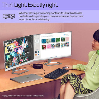 This thin-and-light 27-inch FHD monitor is designed to look great in any space. Whether learning, playing, or watching content, its ultra-thin 3-sided borderless design lets you create a seamless dual-screen setup for enhanced viewing, while the simplified cable management cuts the clutter. Plus, easily connect with one VGA and two HDMI 1.4 ports.