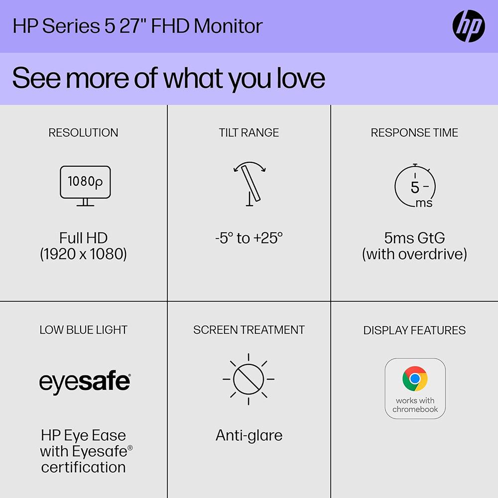 From mastering new skills to diving into a hobby, this 27" FHD monitor is designed to help keep you focused. With a tilt adjust stand and the Ergonomic Setup Guide in HP Display Center you can customize your comfort. Plus, HP Eye Ease with Eyesafe certification limits blue light to keep your eyes comfortable without impacting color accuracy, so you can do more, longer.