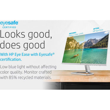 Increase viewing comfort with Eyesafe technology that doesn't sacrifice color quality. Monitor designed with sustainability in mind with 85% recycled materials and packaged in recycled materials. Doing good never looked so good.