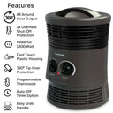 - Safety features include 360 degree Safety Tip, which shuts the heater off if it is tipped in any direction