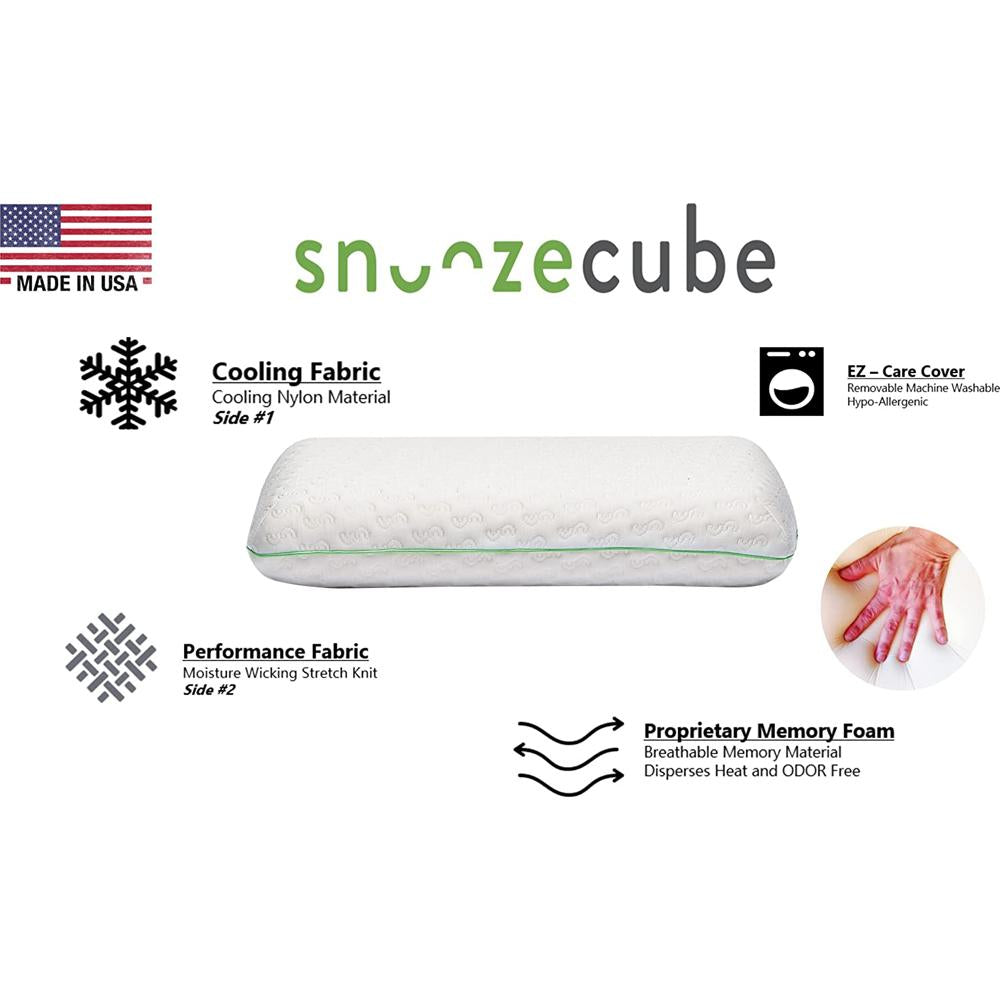 With Comfort and Support in mind, we've created your go-to Pillow. A perfect design for any sleep position. Snoozecube is crafted from our proprietary memory foam that breathes, contours, supports, and is odor-free. Our Dual Climate Cover is cool-to-the-touch fabric on one side and moisture-wicking fabric on the other. It’s removable, machine washable, stain-resistant, and hypoallergenic.