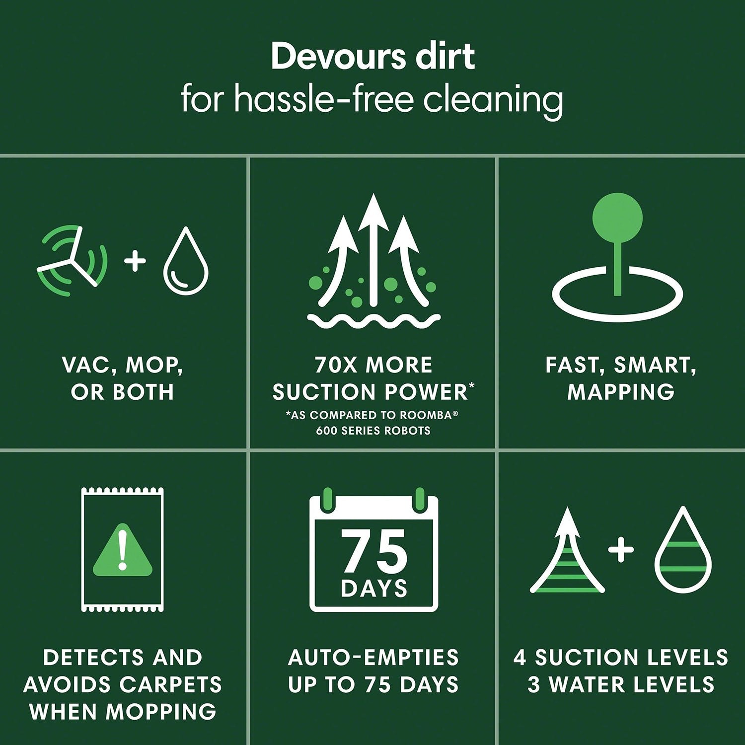 Dirt and dust stay gone because it empties into the AutoEmpty dock for up to 75 days.