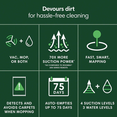 Tackle any and every mess—and leave the debris to us. The Roomba® 105 Combo Robot + AutoEmpty™ Dock is made for every kind of wet and dry task, with 70X more suction, better navigation and a self-emptying dock. Whether you mop, vacuum, or both, enjoy up to 75 days of hassle-free, autonomous cleaning.