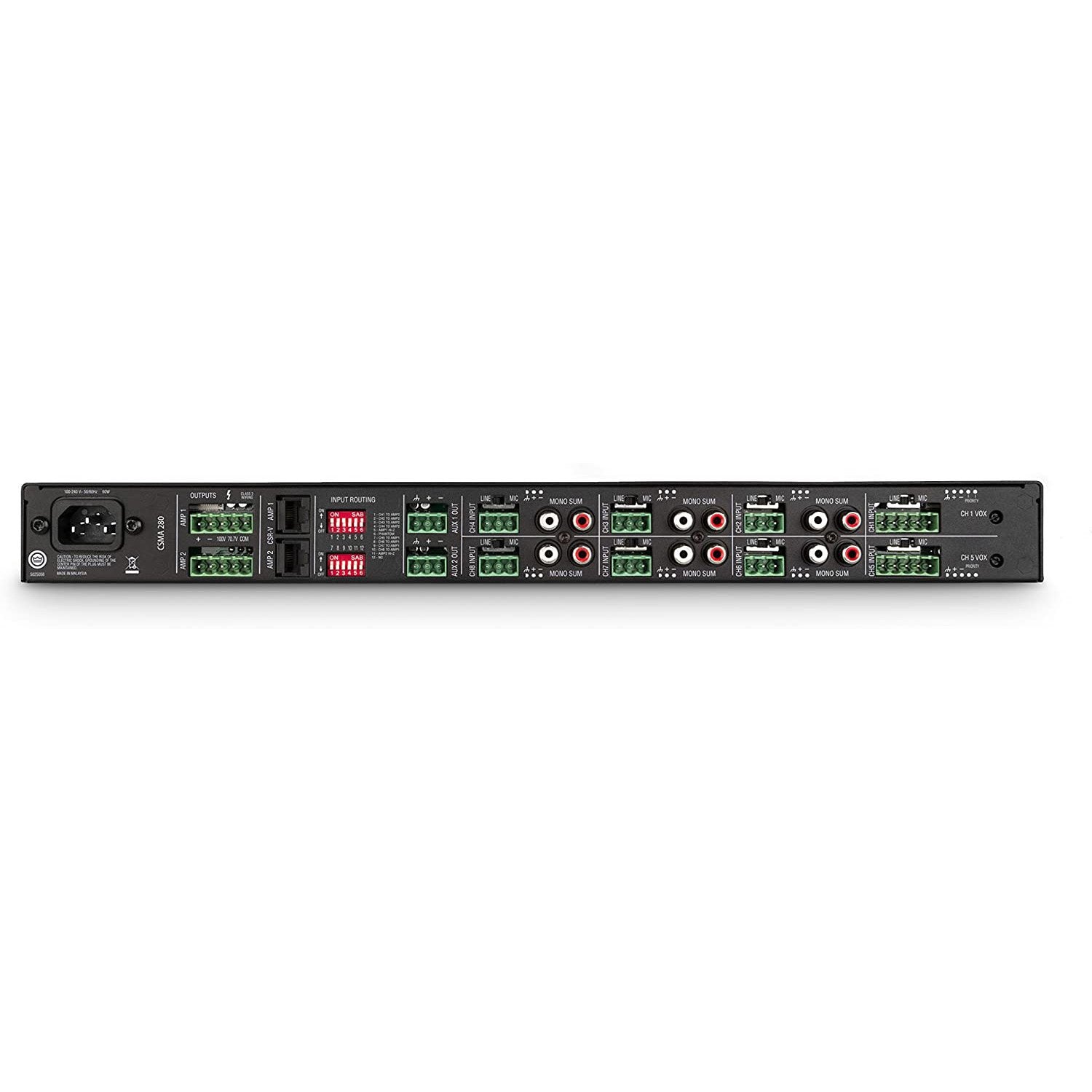 The CSMA mixer/amps offer unmatched ease of use, with a clean, front panel featuring only volume controls for each channel, master volume adjustment, adjustable bass and treble controls and a power switch. All the volume controls are surrounded by an illuminated ring, making them easy to see and operate in darkened environments. The amplifier can drive 8 ohm and 4 ohm loads and can be used with 70V and 100V distributed audio systems without the need for a separate transformer. In addition to balanced mic/line inputs, unbalanced RCA inputs and speaker connections, all units include RJ45 connectors for use with JBL CSR-V in-wall volume controls. All models feature a universal power supply which enables the ability to accept AC voltages from 100 to 240 VAC, 50/60Hz.