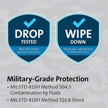 - With military-grade drop and wipe down protection; this case is ready for anything. Meets MIL-STD-810H Method 504.3 Contamination by Fluids and MIL-STD-810H drop testing
