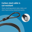 - Carbon steel cable is cut-resistant. Plastic sheathing protects desks; tables; and other fixed-structure attachment points