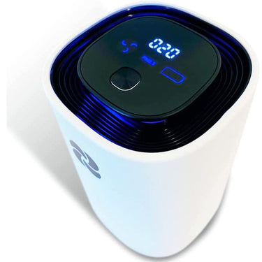 Standing less than 5 inches tall with a sleek design, this device is perfect by your bedside, in your car with the cup holder accessory included, or anywhere you travel. Two fan speeds, never exceeding 40dB.