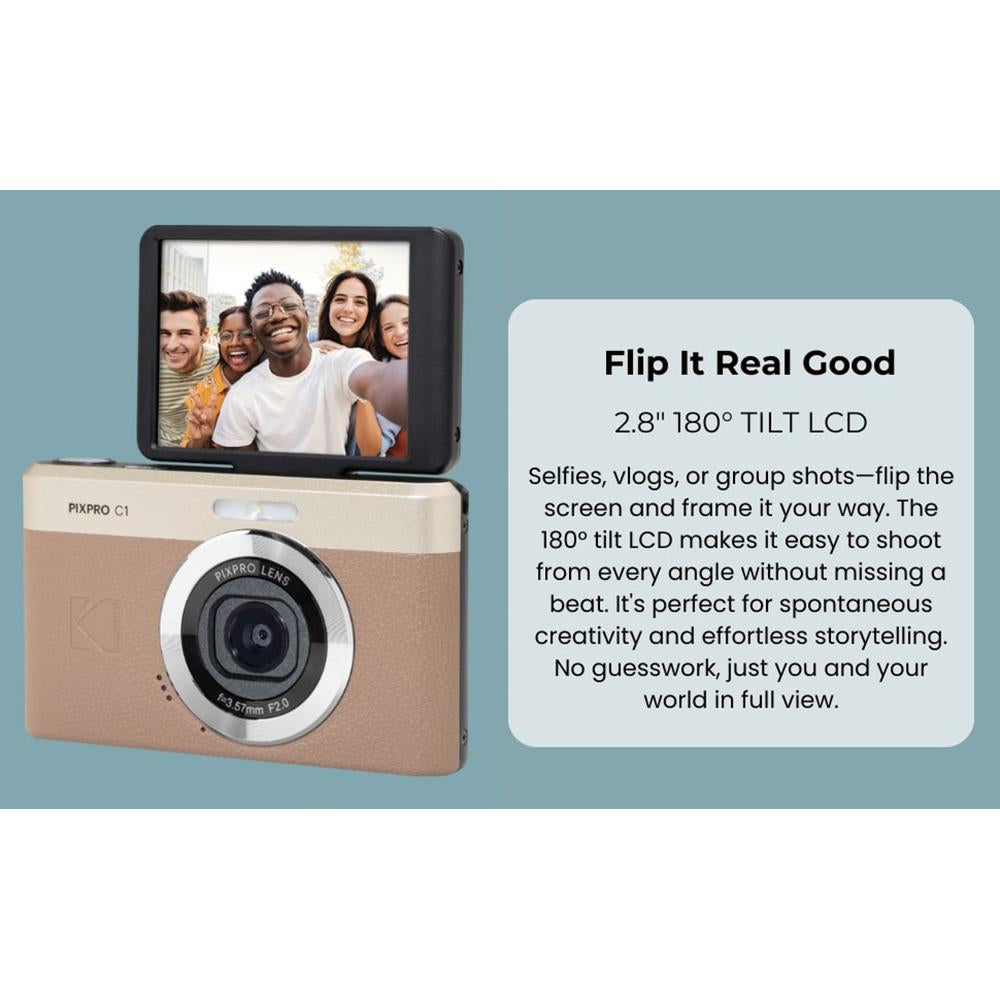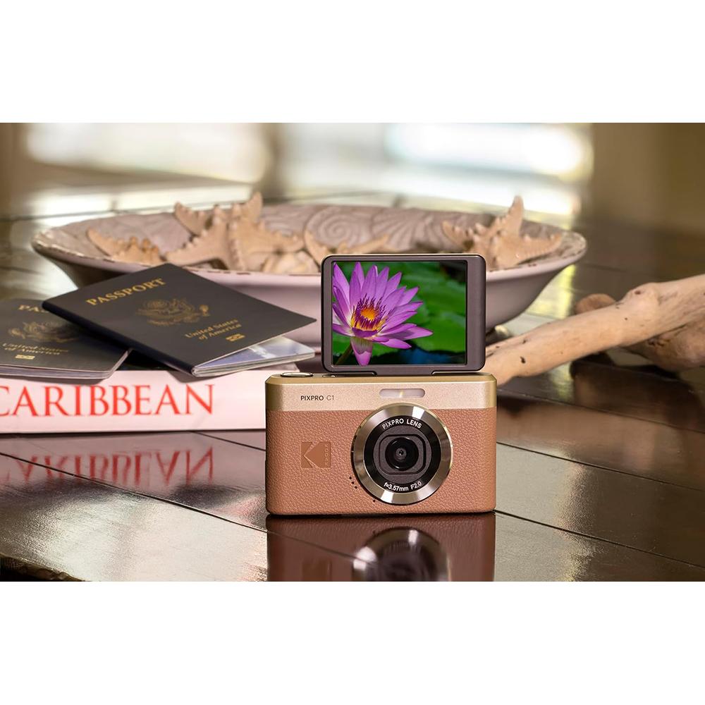 - KODAK PIXPRO C1-BN 13MP, Flip-up LCD, Built-in Rechargeable Battery, Selfie Digital Camera (Brown)