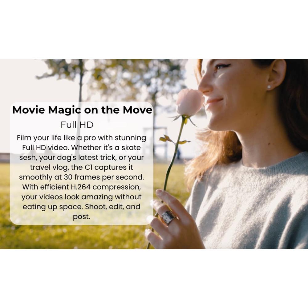 Full HD: Film your life like a pro with stunning Full HD video. Whether it's a skate sesh; your dog's latest trick; or your travel vlog; the C1 captures it smoothly at 30 frames per second. With efficient H.264 compression; your videos look amazing without eating up space. Shoot; edit; and post.