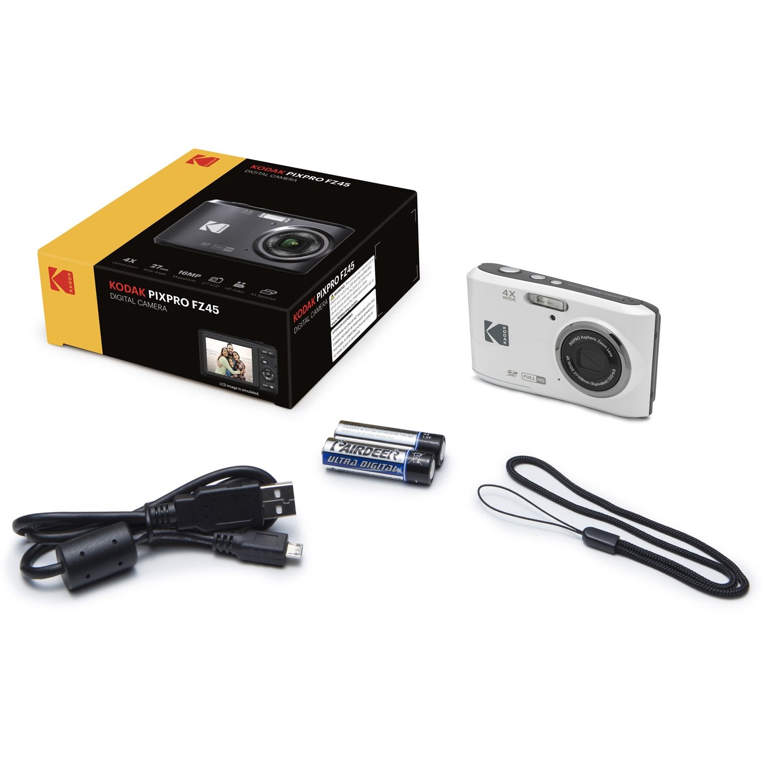 Introducing the FZ45, Friendly Zoom model from the KODAK PIXPRO collection of digital cameras. Compact, intuitive and oh so easy to use, the FZ45 is the perfect camera to take anywhere you go. One-touch video, red-eye removal, face detection and convenient AA batteries are just the start.