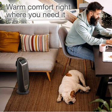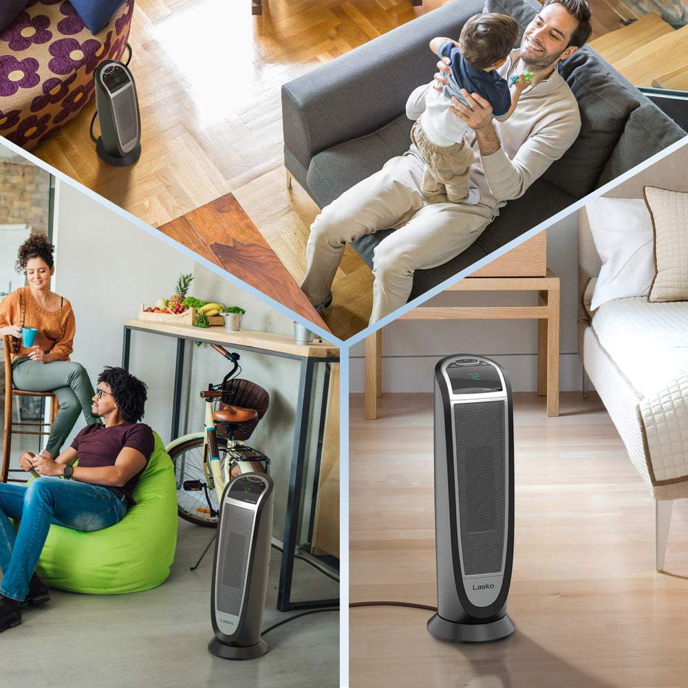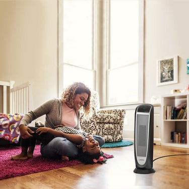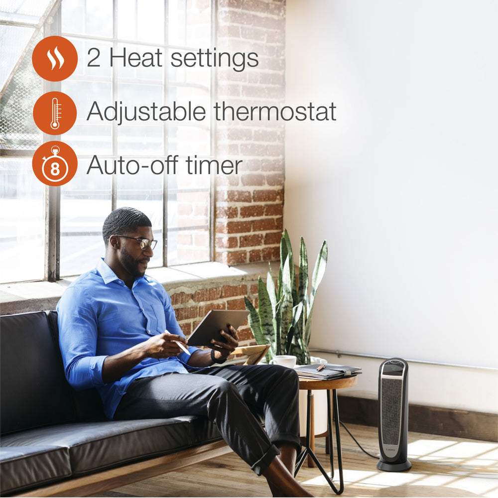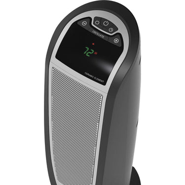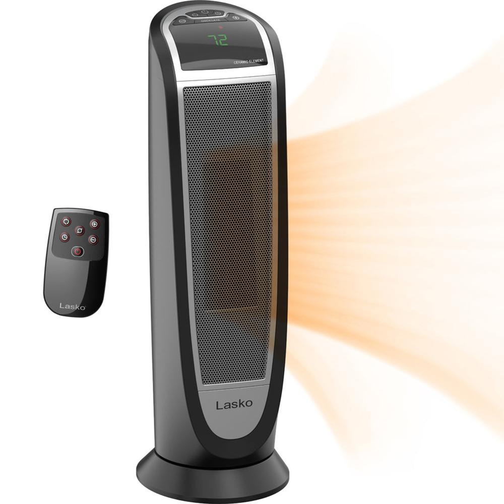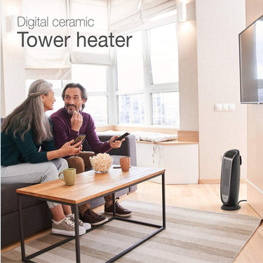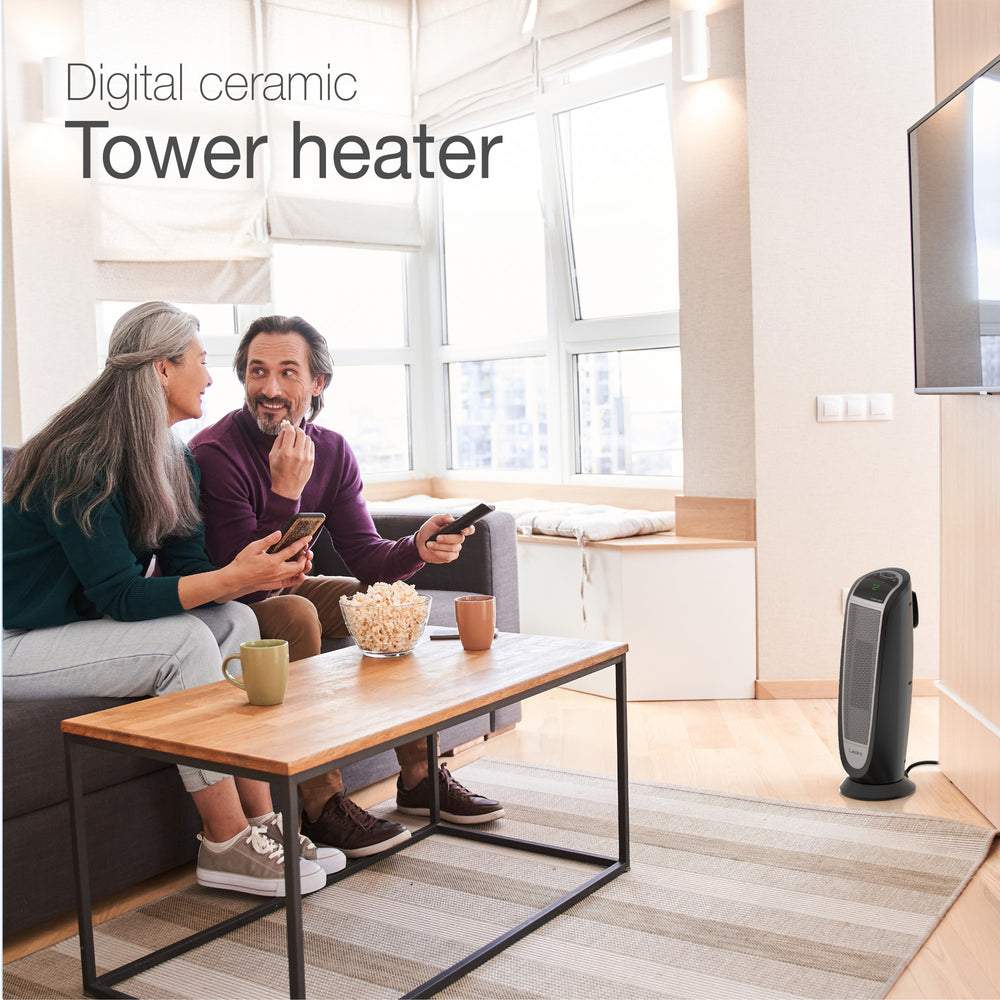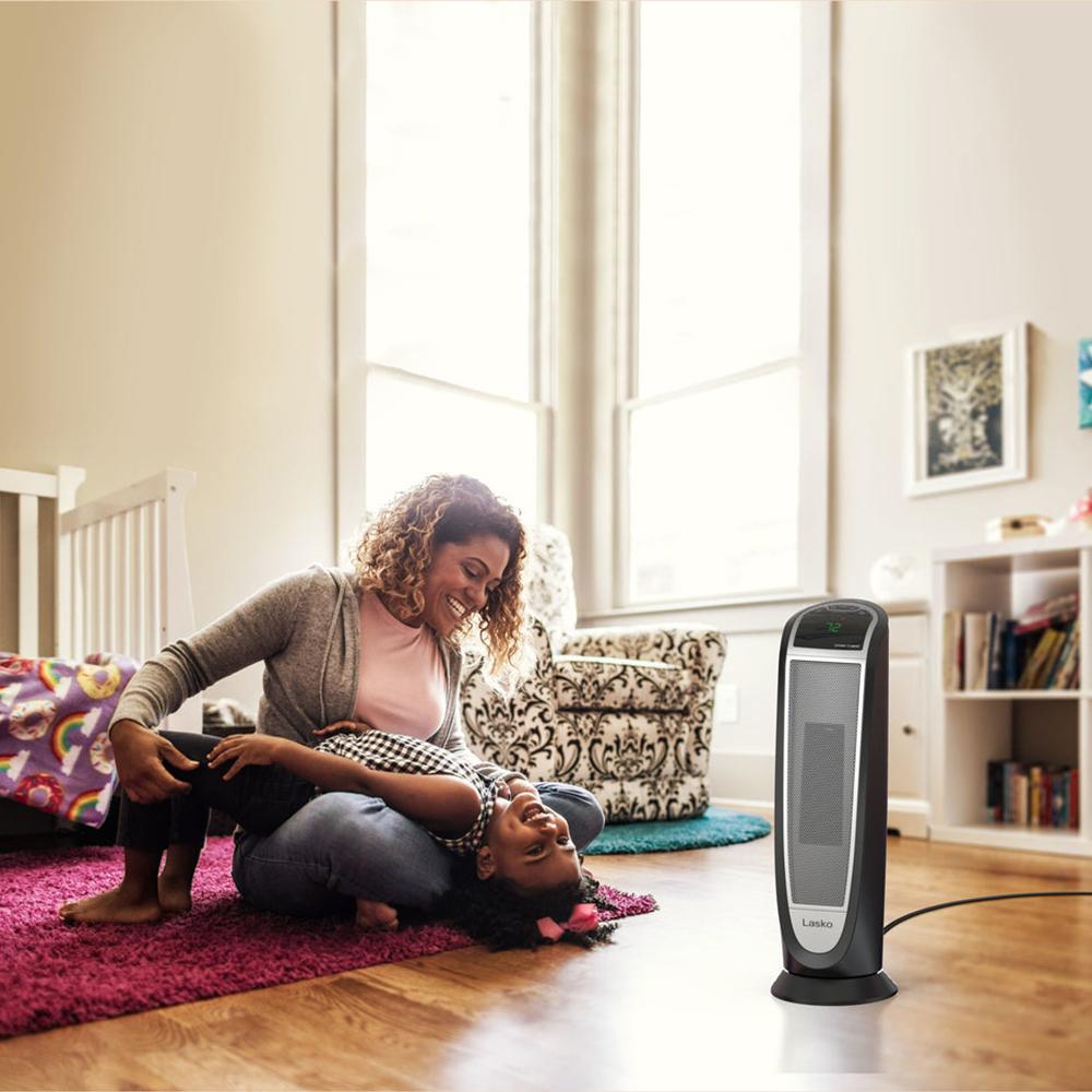 Quickly warm-up with a Lasko Digital Ceramic Tower Heater with Remote Control. This heater is designed with an elongated heating element to distribute 1500 watts of soothing warmth. Easy-to-operate digital controls run a programmable thermostat; 8 hour auto-off timer and 2 quiet heat settings. It's widespread oscillation evenly disperses heat throughout the room. The automatic overheat protection provides safety and peace of mind. Includes an easy-grip carry handle and a convenient onboard remote control storage area. 3 year limited warranty.
