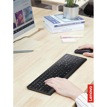 The Lenovo 510 Wireless Combo Keyboard & Mouse compliments your desk with a simple yet elegant design. Easily connects wirelessly with PCs using a nano-USB receiver. The keyboard features a durable; water-resistant casing equipped to handle the occasional spill. The island keys are designed to increase typing accuracy and comfort. The accompanying wireless mouse has ambidextrous design and features a 1200 dpi optical sensor for accurate pointing.