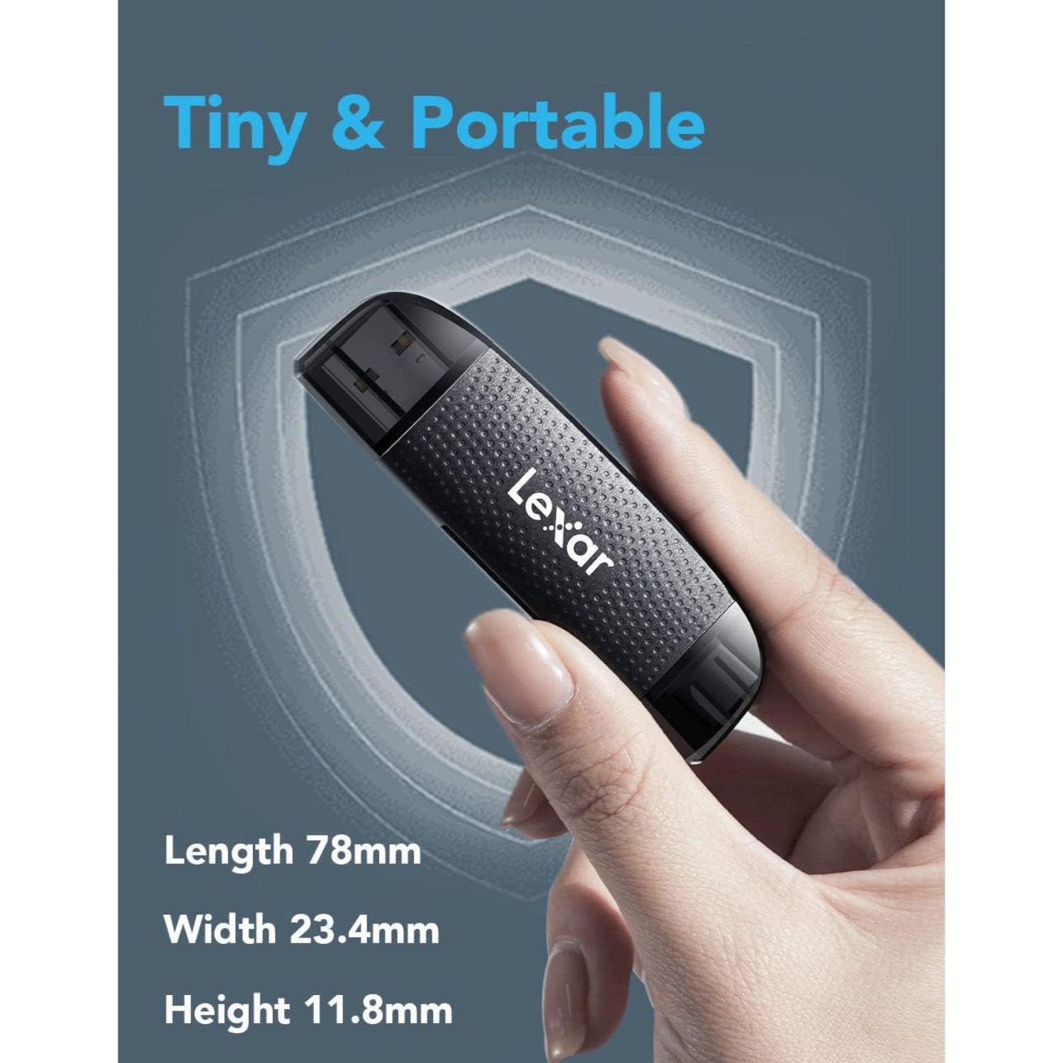 The Lexar Dual-Slot USB-A/C Reader features a compact and portable design that easily fits in any pocket or bag. And for added portability, the reader sports a key chain loop to attach to any backpack or key ring.