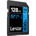 Lexar's 128GB High-Performance 800x PRO UHS-I SDXC Memory Card (BLUE Series) is designed for point-and-shoot cameras, mid-range DSLR cameras, and HD camcorders. It offers 128GB storage capacity and uses the UHS-I bus for quick 4K, Full HD, 3D video captures. With maximum read speeds of 150 MB/s and write speeds of 45 MB/s, it ensures minimum write speeds don't drop below 30 MB/s. The card is resistant to water, shock, vibration, and x-rays, and can withstand temperatures ranging from 32 to 158°F. Its 10-year warranty covers any compromised card.