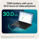 - Enjoy up to 30 hours of video playback with a powerful 72Wh battery