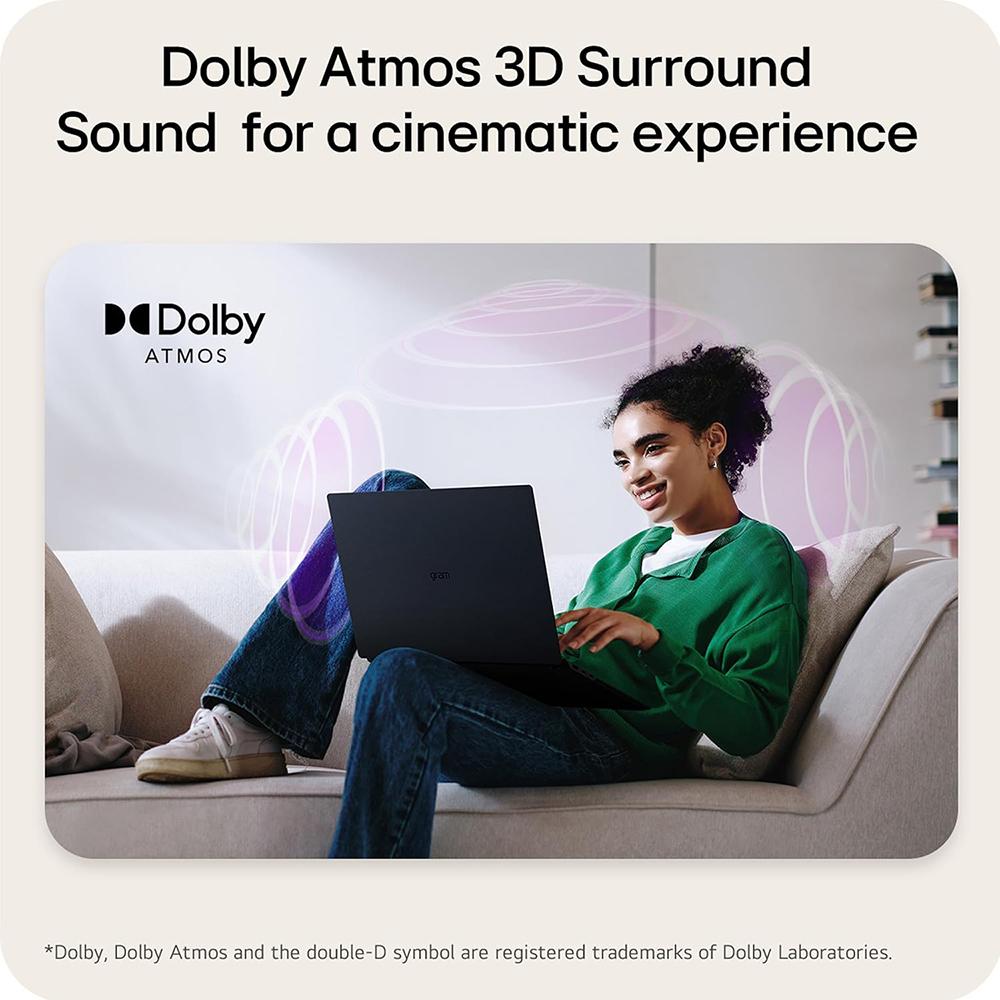The gram features four built-in speakers delivering rich, powerful sound great for music, movies, and more. Dolby Atmos6 3D Surround Sound adds a cinematic experience with 360-degree audio, powered by a 4-channel amplifier. Enjoy premium, immersive sound - anywhere you go.
