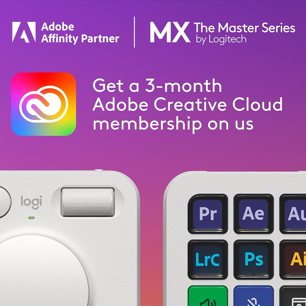 - 3-months of Adobe Creative Cloud on us (a value of $179) - Pair two of the world's top creative tools. Buy one MX Creative Console and claim your free 3-month Adobe Creative Cloud membership